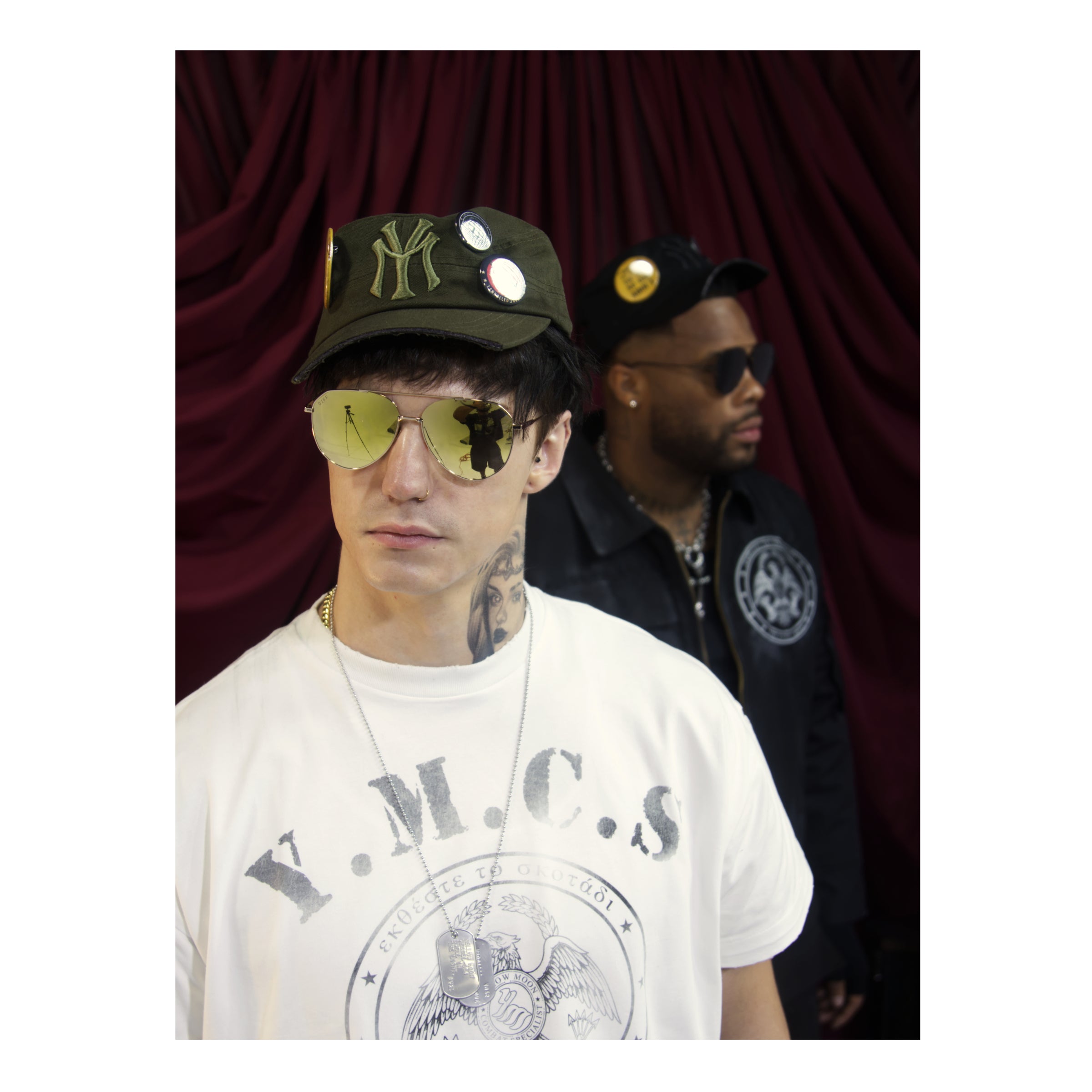 Distressed Cadet hat with shorten bill and various pins. Strap Closure. THESE PRODUCTS ARE DISTRESSED IN HOUSE AND WILL UNIQUELY VARY.