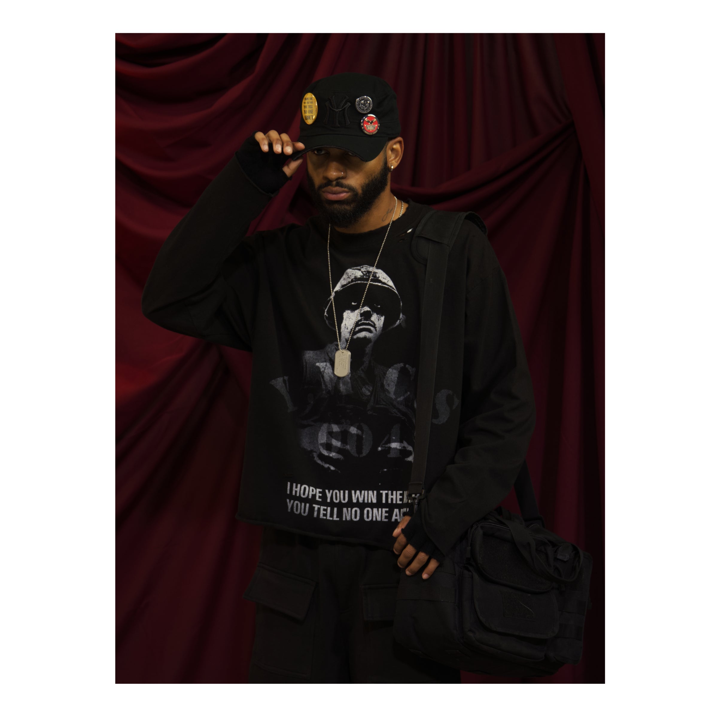 Distressed Cadet hat with shorten bill and various pins. Strap Closure. THESE PRODUCTS ARE DISTRESSED IN HOUSE AND WILL UNIQUELY VARY.