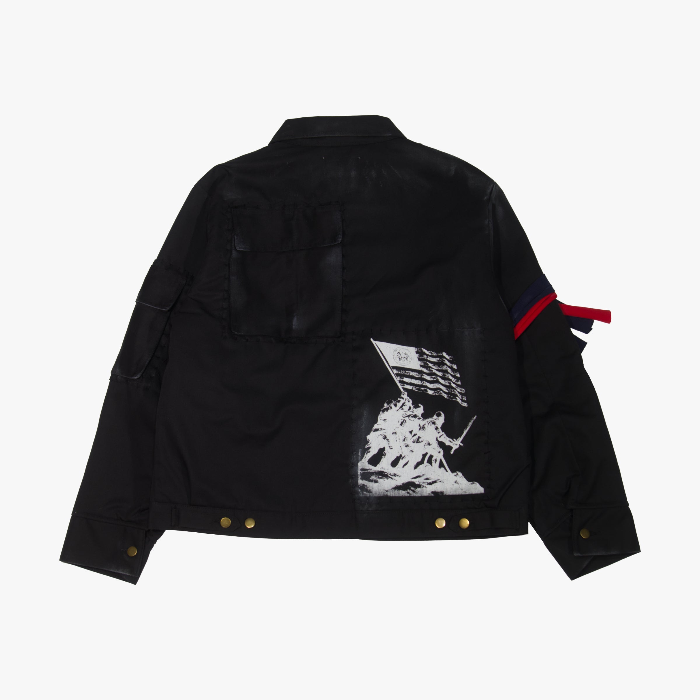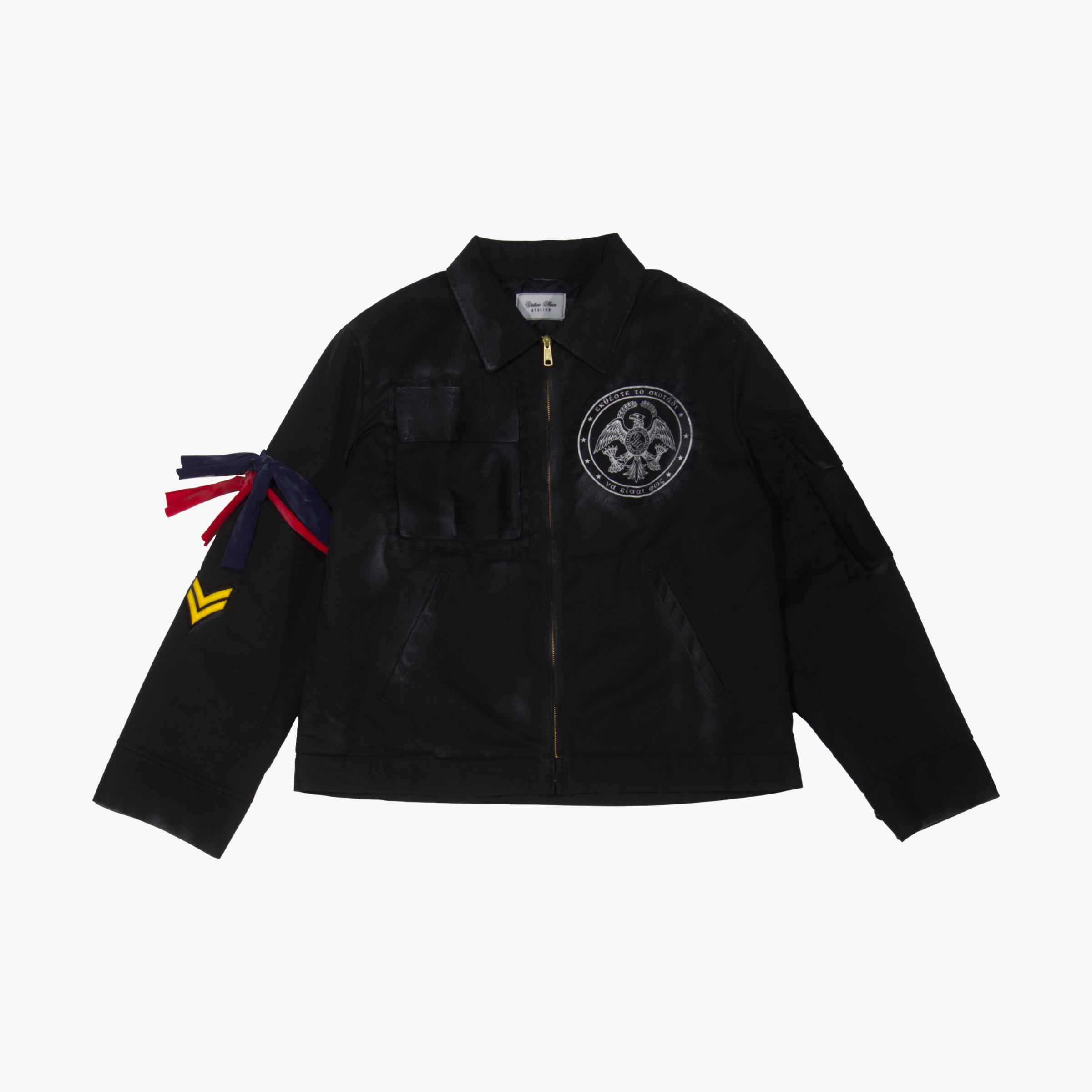 A nylon zip jacket with hand stitched, screen printed patches. This jacket is a one of one and will not be remade.